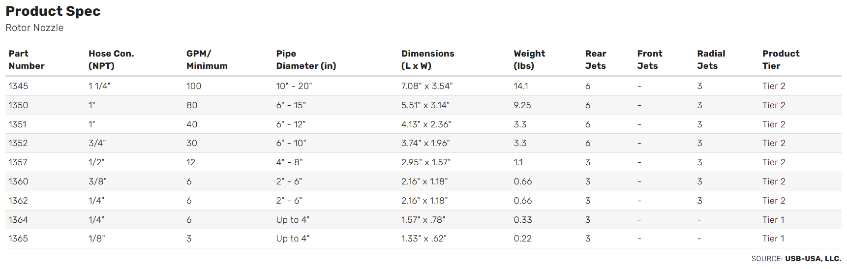 Three one-piece ceramic nozzle inserts located in the middle rotating section with spray angles of 90°/75°/60° will remove grease, dirt and light roots from the pipe. Rear propulsion jets help flush the material removed. The non-corrosive rotating center requires low maintenance as the rest of the nozzle is constructed hardened stainless steel.
